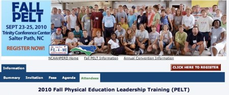 Background: The 2010 Fall PE Leadership Training (Pine Knoll Shores, NC) still has room for you! To find out more about this terrific conference, please click on the above graphic!