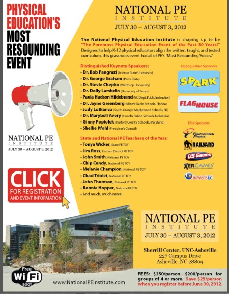 We will be placing a full-page ad for the 2012 National Physical Education Institute in Midwest District AHPERD’s “Midwest Happenings” Newsletter. This will go out to all Midwest District AHPERD members in the states of Illinois, Indiana, Michigan, Ohio, West Virginia, and Wisconsin!